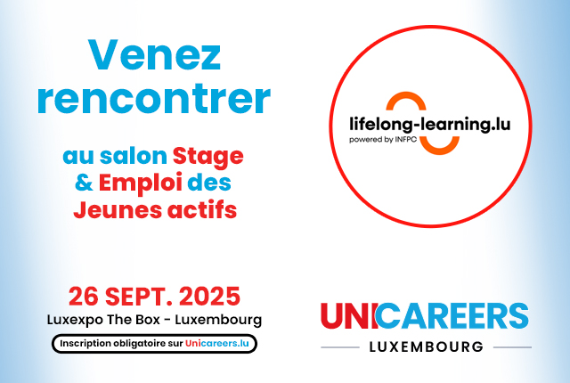 Le salon Stage & Emploi se tiendra le 26 septembre 2025. Rendez-vous sur le stand lifelong-learning.lu pour découvrir les offres de formation et toute l'information sur la formation tout au long de la vie.